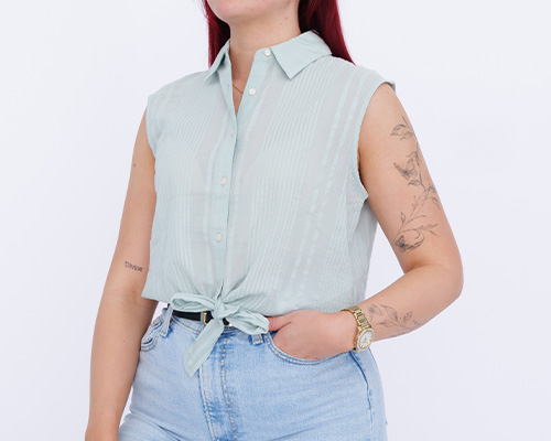 Dámská halenka bez rukávů mintové barvy na zavázání v pase