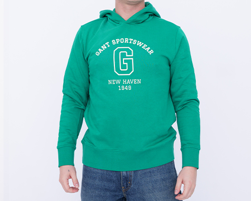 Pánská mikina zelené barvy s kapucí a potiskem na přední straně