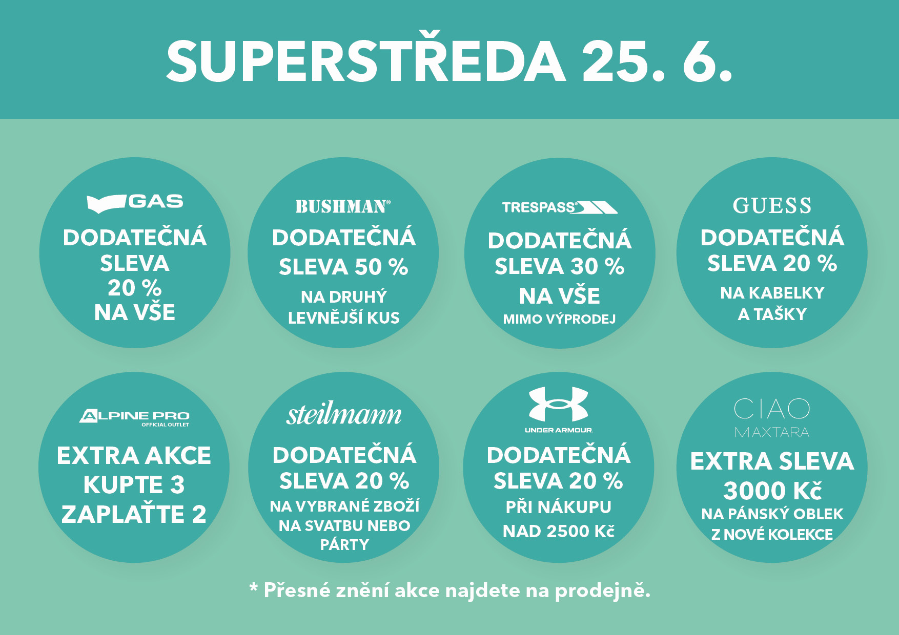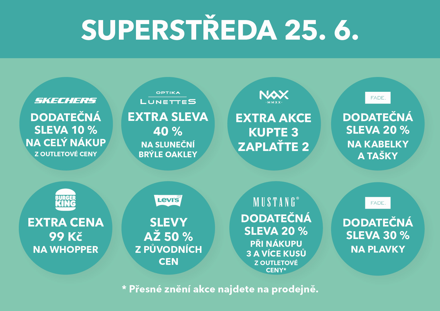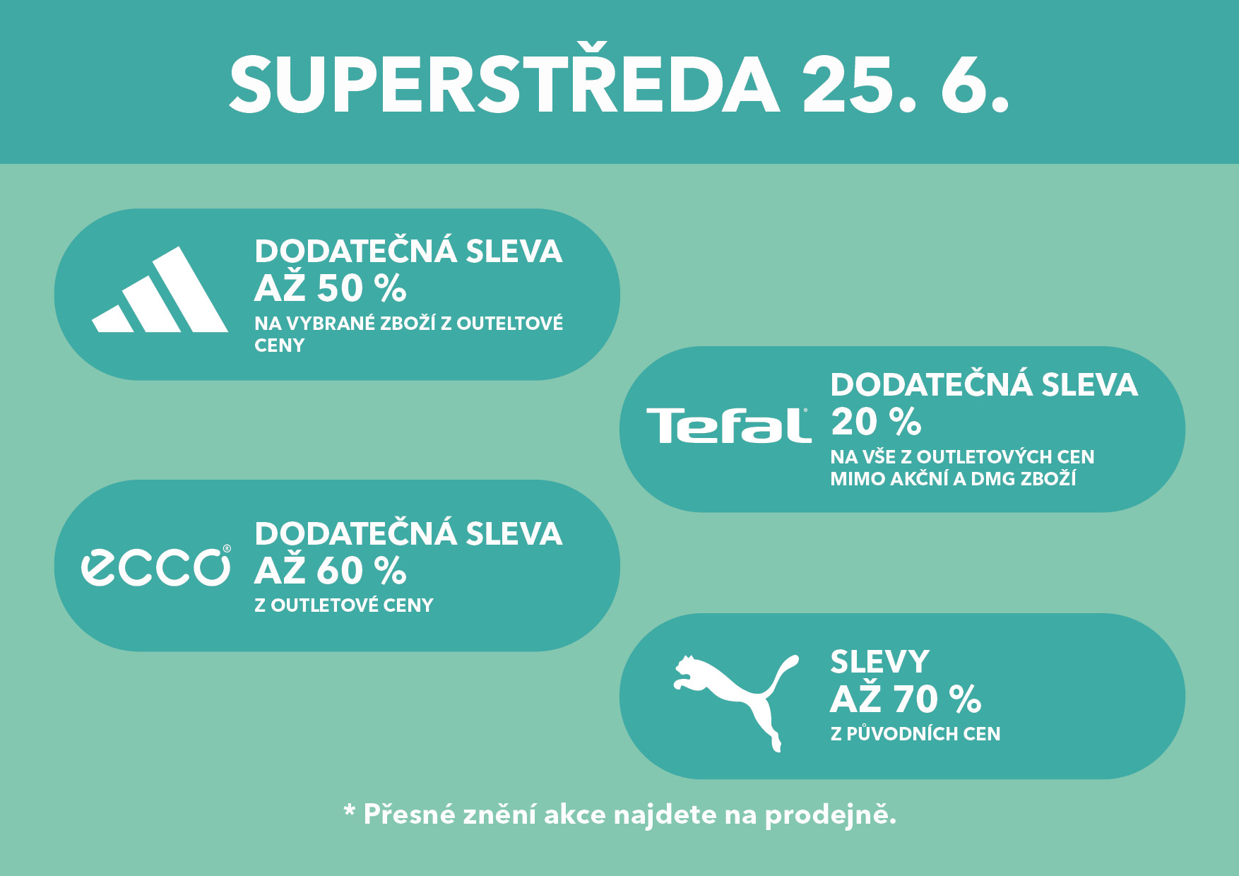 A co to znamená? Že se do outletu vrací vaše oblíbená akce a navíc si ji letos můžete užít častěji. Superstředa přináší extra dodatečné slevy i uprostřed týdne, a nyní každý měsíc. Přijďte si udělat radost i uprostřed týdne a využít skvělých slev u svých oblíbených značek.
