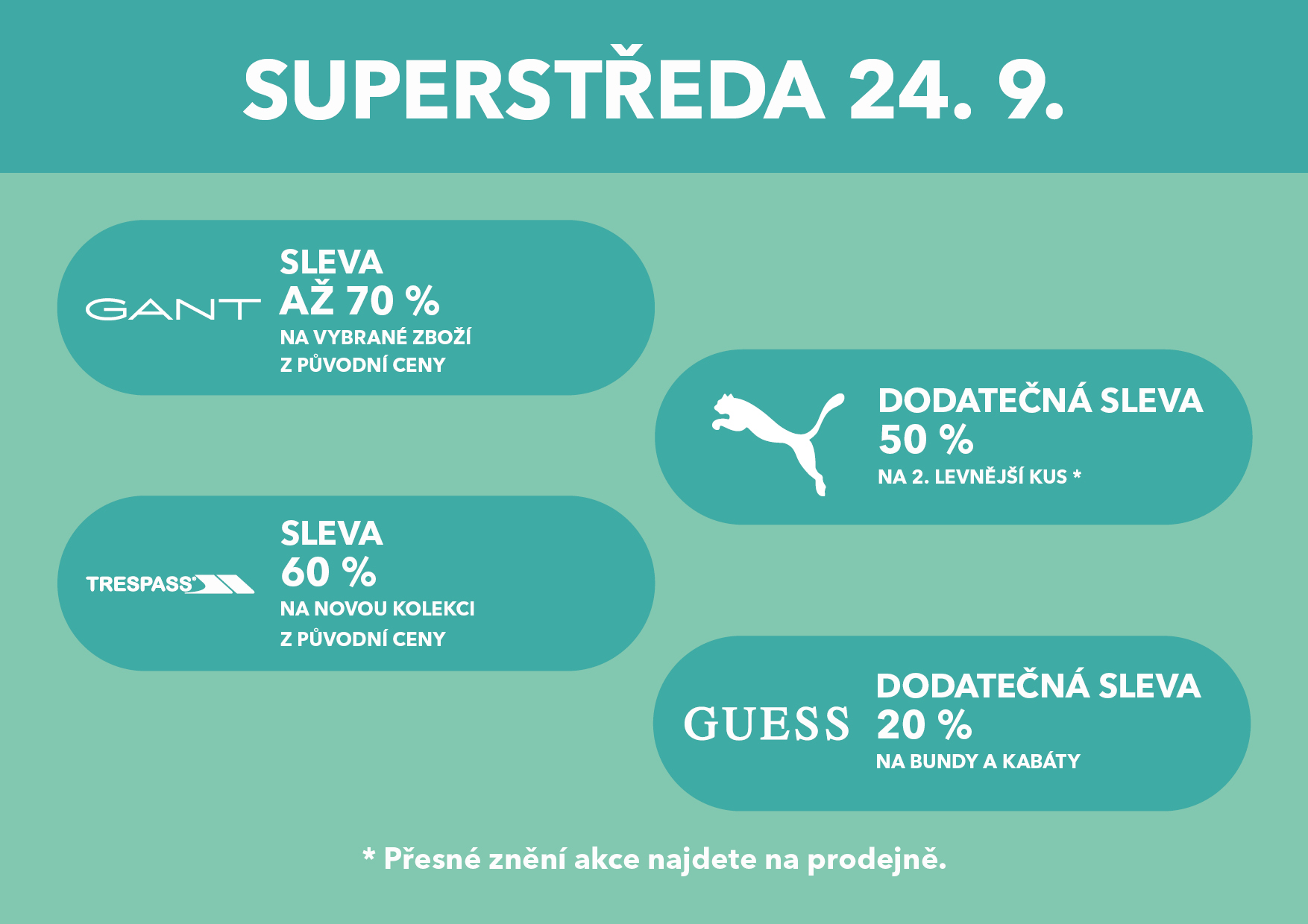 A co to znamená? Že se do outletu vrací vaše oblíbená akce a navíc si ji letos můžete užít častěji. Superstředa přináší extra dodatečné slevy i uprostřed týdne, a nyní každý měsíc. Přijďte si udělat radost i uprostřed týdne a využít skvělých slev u svých oblíbených značek.