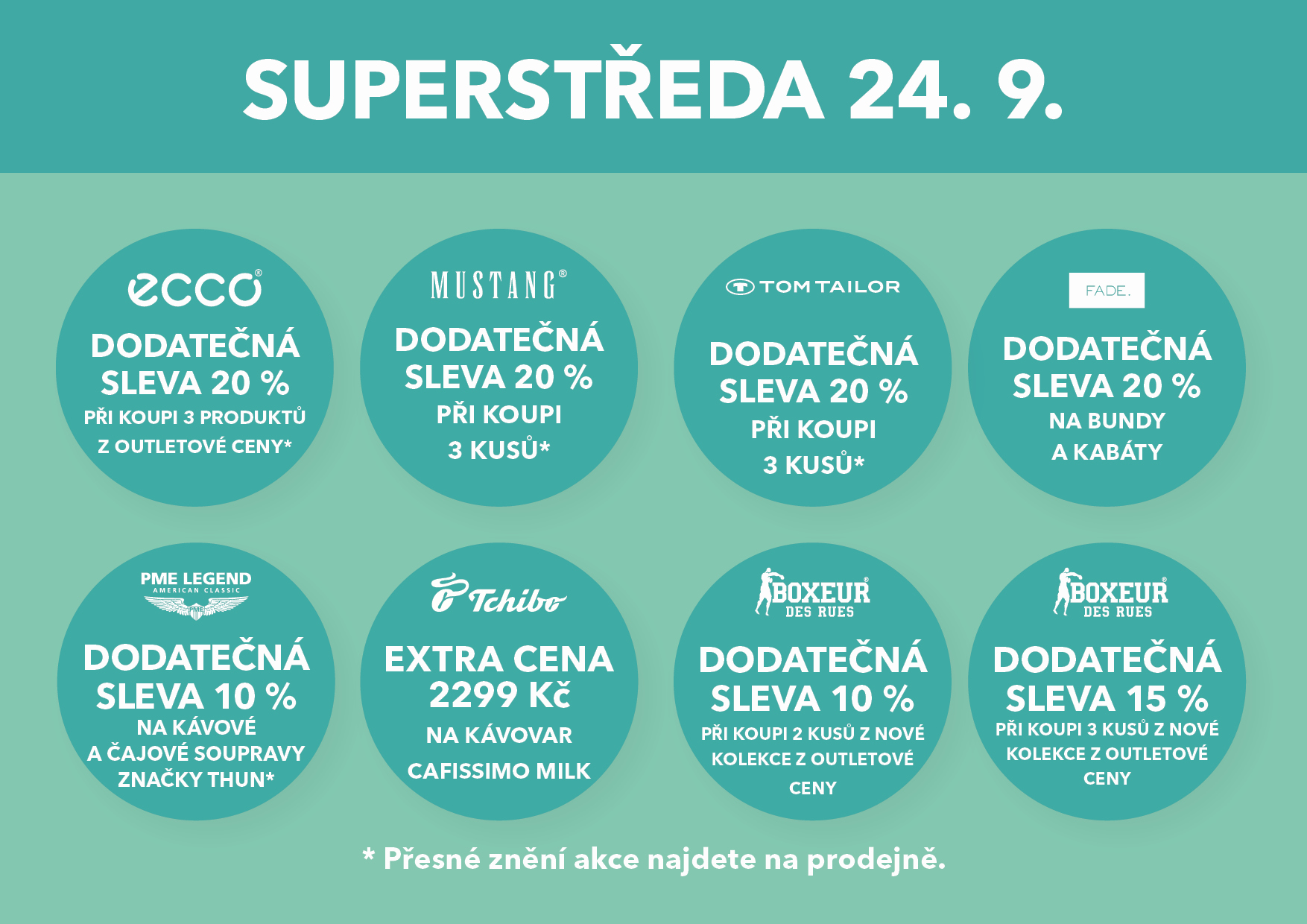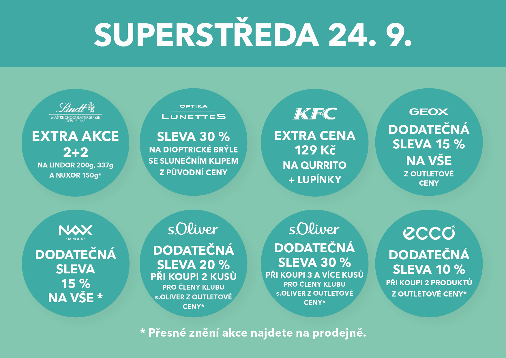 Je jedno, jaký styl vyznáváte nebo zda jdete nakupovat oblečení či obuv. V našem outletovém centru najdete výhodné nabídky na každém rohu. Slevová Superstředa se vztahuje na obchody přehledně označené kulatou samolepkou.