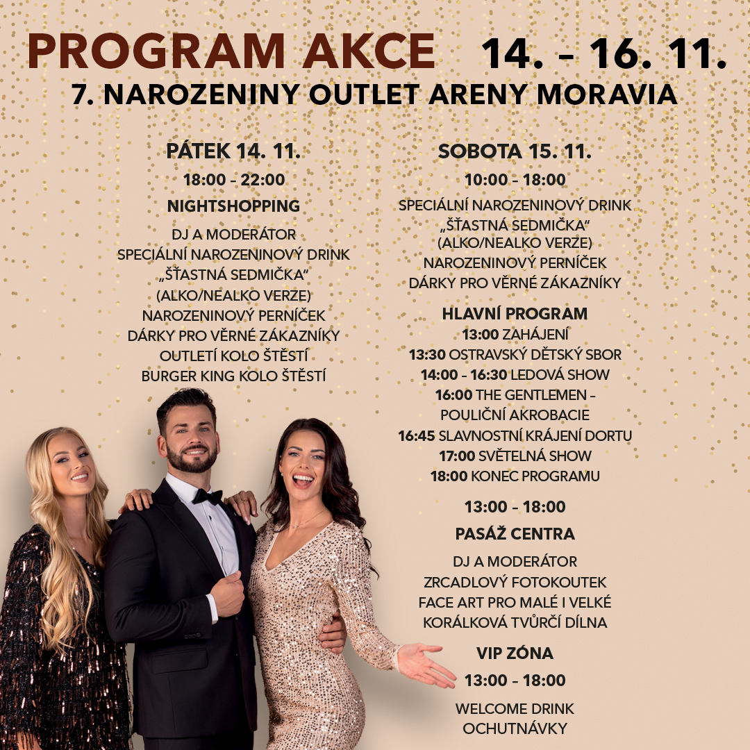 Můžete se začít těšit. Stejně jako každý rok chceme i letos oslavit naše narozeniny s těmi, které máme rádi, a tak vás zveme na oslavy. Přijďte s námi oslavit 7. narozeniny Outlet Arena Moravia o víkendu 14. – 16. listopadu.