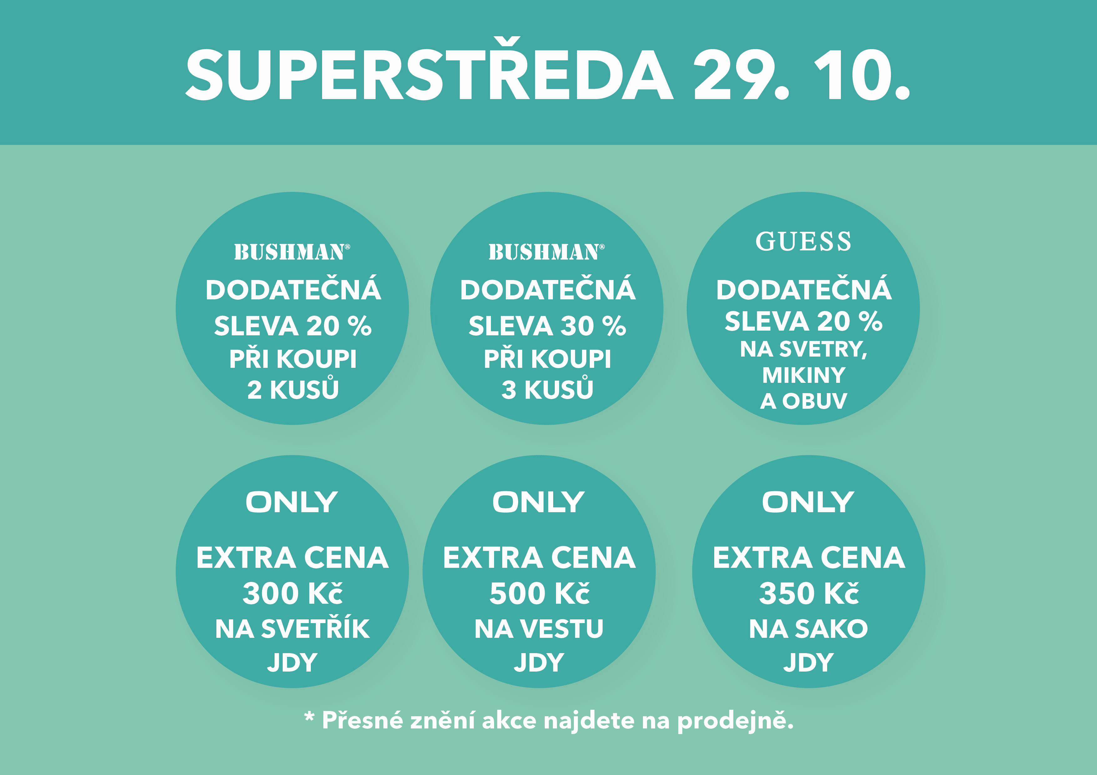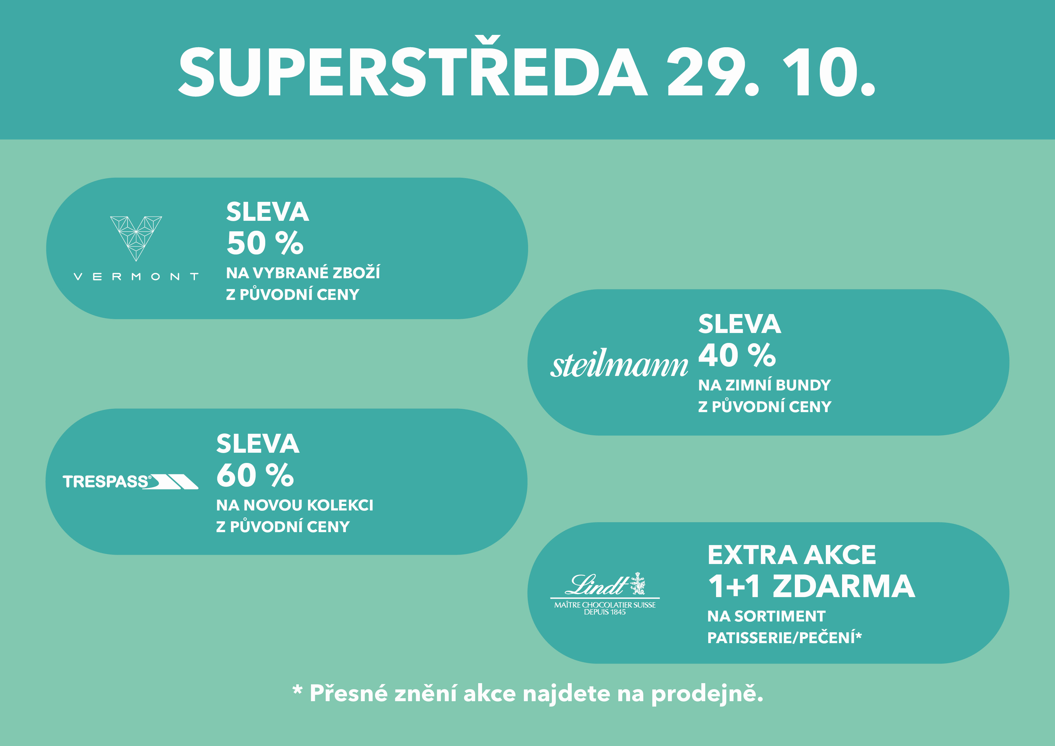 Desátá letošní Superstředa nás čeká už 29. října, tak nás sledujte a nenechte si ujít naše slevy. Zveřejníme je brzy zde či na našich sociálních sítích.