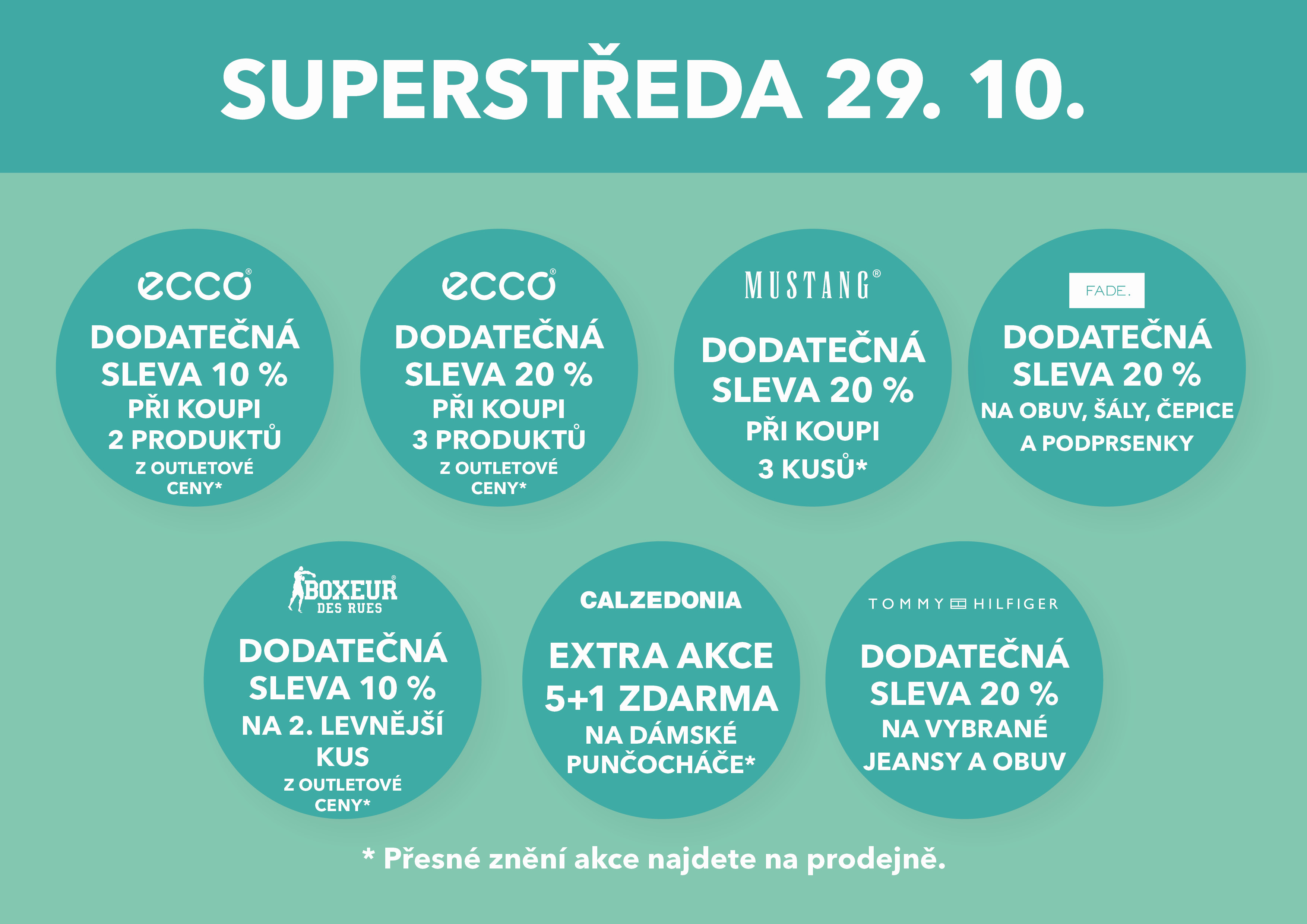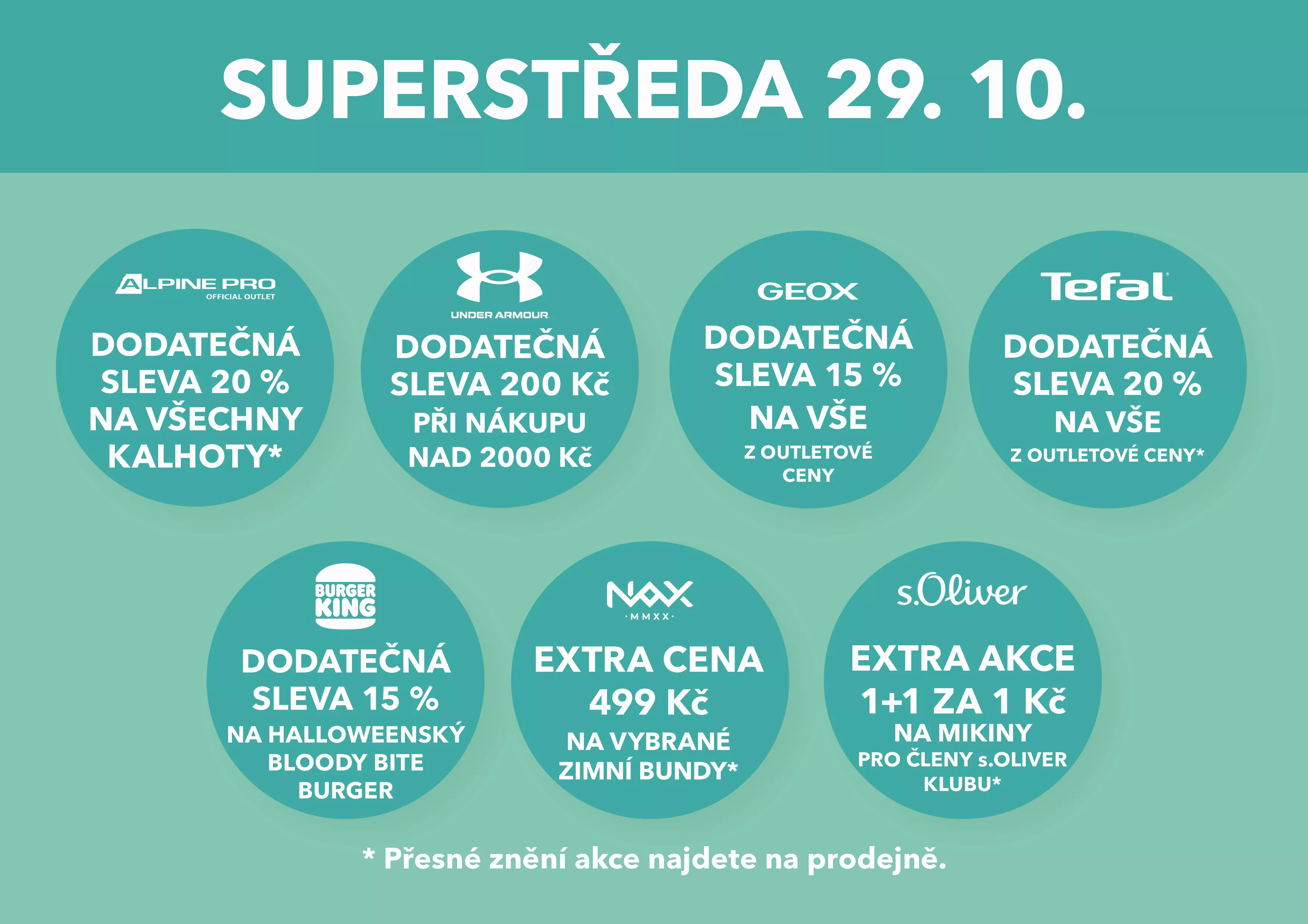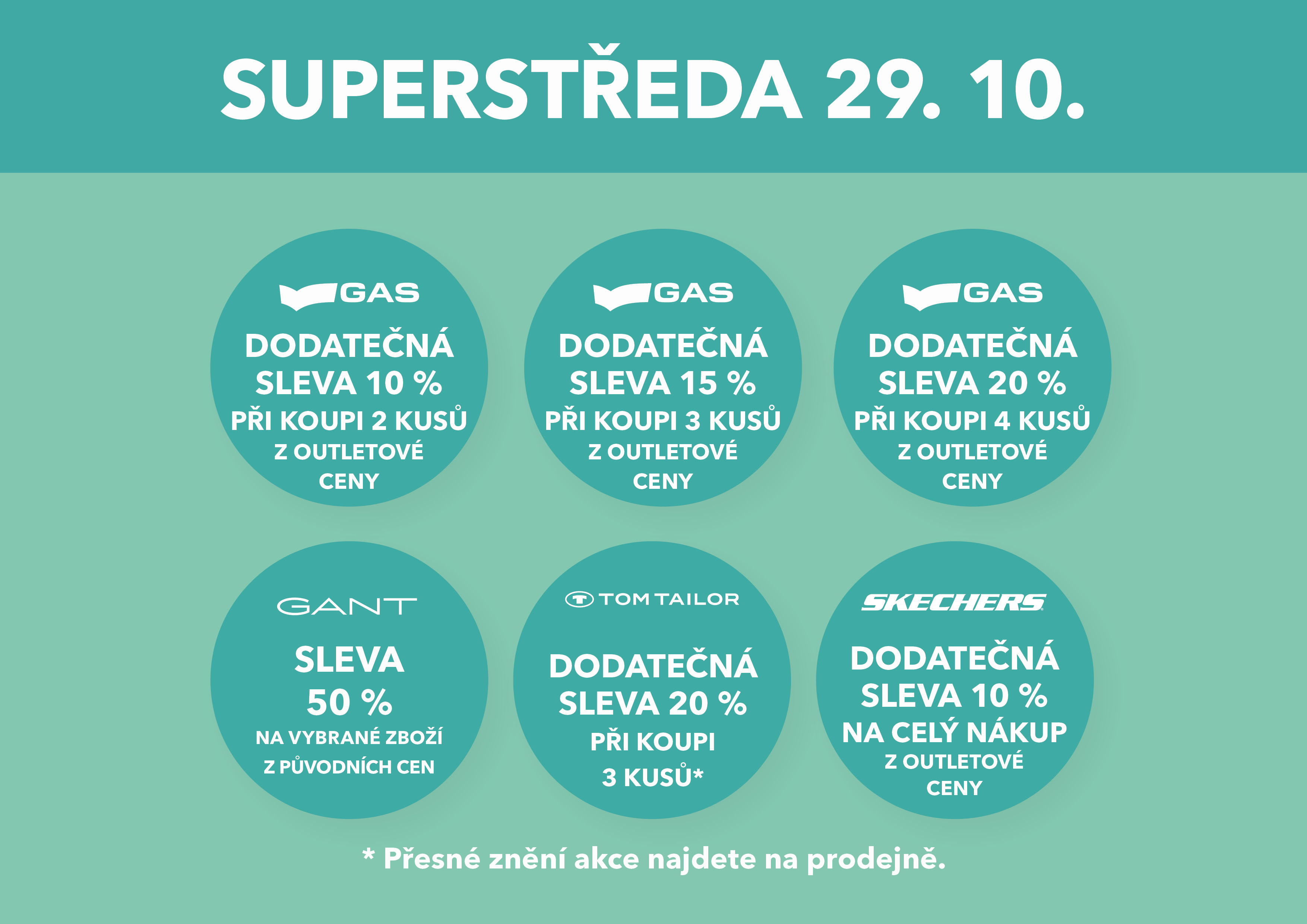 A co to znamená? Že se do outletu vrací vaše oblíbená akce a navíc si ji letos můžete užít častěji. Superstředa přináší extra dodatečné slevy i uprostřed týdne, a nyní každý měsíc. Přijďte si udělat radost i uprostřed týdne a využít skvělých slev u svých oblíbených značek.