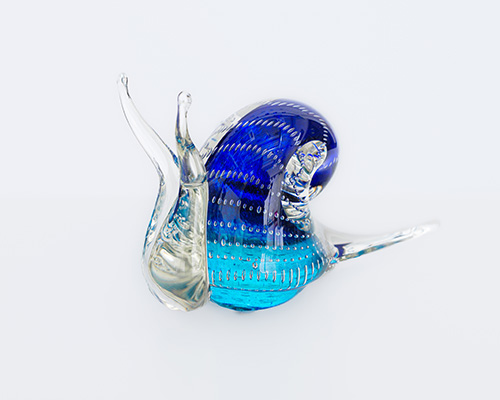 Skleněná ručně foukaná soška ve tvaru šneka v barevném provedení