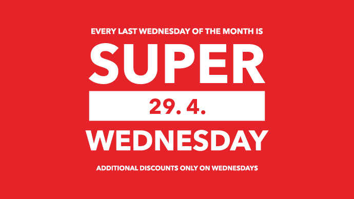 And what does that mean? That Super Wednesday brings extra additional discounts even in the middle of the week, every month. Come and treat yourself in the middle of the week and take advantage of great discounts on your favorite brands. It doesn’t matter what style you follow or whether you’re shopping for clothes or shoes. In our outlet center, you’ll find great deals on every corner. Discount Super Wednesday applies to stores marked with a round red sticker. April’s Super Wednesday awaits us next week, April 29. We’re currently finalizing the list of specific discounts and participating stores for you. Follow us on the website and on social networks.