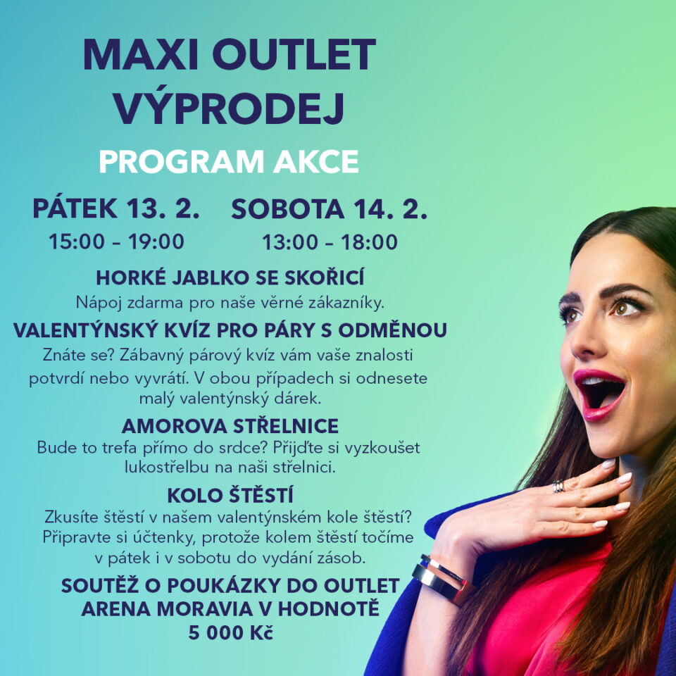 Oblíbená víkendová akce Maxi Outlet Výprodej se blíží. Finální výprodeje zimní sezony proběhnou od 13. do 15. února a vy už se můžete začít těšit. Čekají vás atraktivní sezonní slevy vašich oblíbených značek až 80 %, doprovodný program s valentýnskou tematikou, kolo štěstí a soutěže o poukázky do našeho outletového centra. Výprodejový víkend pro vás právě připravujeme, a již brzy přineseme další podrobnosti k programu.