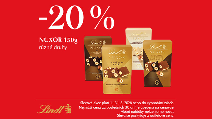 Sleva značky Lindt DODATEČNÁ sleva 20 % Nuxor Slevy Využijte akční nabídku od značky Lindt a získejte Dodatečnou slevu 20 % na Nuxor 150 g různé druhy z outletové ceny. Nelze kombinovat s jinou akcí. Slevu u nás najdete od 1. 3. – 31. 3. 2026 nebo do vyprodání zásob. Zpět na slevy Slevy
