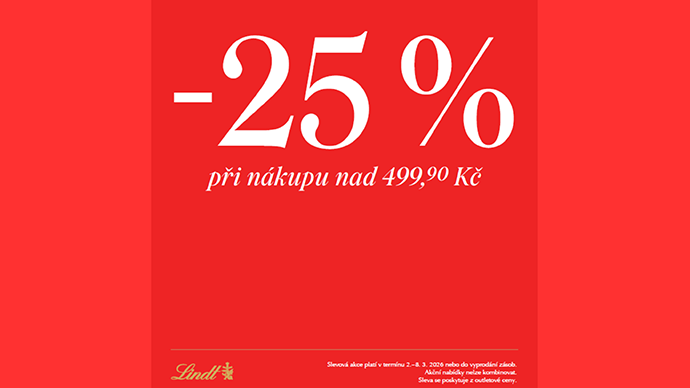 Využijte akční nabídku od značky Lindt a získejte Dodatečnou slevu 25 % při nákupu nad 499,90 Kč z outletové ceny. Nelze kombinovat s jinou akcí. Slevu u nás najdete od 2. 3. – 8. 3. 2026 nebo do vyprodání zásob.