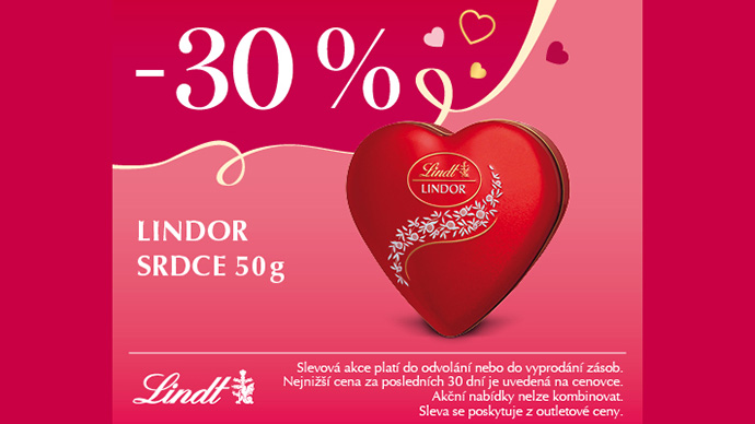 Sleva značky Lindt DODATEČNÁ sleva 30 % na LINDOR SRDCE Slevy Využijte akční nabídku od prodejny Lindt a získejte Dodatečnou slevu 30 % na LINDOR SRDCE 50g. Akční nabídky nelze kombinovat. Sleva se poskytuje z outletové ceny. Slevu u nás najdete do odvolání nebo do vyprodání zásob. Zpět na slevy Slevy